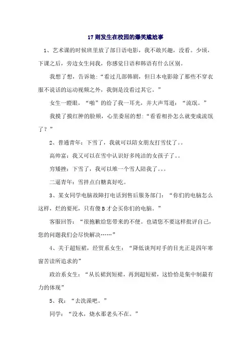 2.体育课上跑步比赛,一位同学居然一不小心跌倒了,结果不知道踩到了什么,居然穿破了裤子,露出了五颜六色的内裤,场面一度乌烟瘴气,全班都笑翻了。