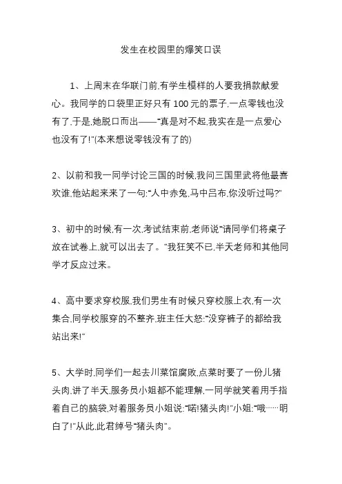 ”哈哈!在睡觉的同学全醒了,大家都在那偷偷的笑9.物理老师讲波:“这是一根粗弹簧,我从两端推它,看,它是不是变密(便秘)了?”10.我也就想不通了,全中国最笨的人么,也就这么100来个呀,怎么会有一半的人都在这个学校的拉,而且偏偏集中在一个班级,居然还碰到我这么聪明的一个班主任,(然后仰天长叹)缘分啊!11.老师问我板最差的一个学生:暑假你看书了吗?学生:看了老师:那20页和21页怎么还粘在一起?我就知道你不能看,放假之前把20页和21页下角都用胶水粘上了12.有一次摸底考试,我们基部的老师几乎全出去学习了。