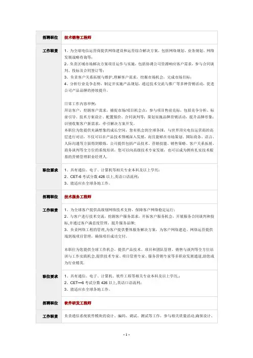 10、华为⽆线⽹络规划理念是什么?综合建⽹成本最⼩、盈利业务覆盖最佳、有限资源容量最⼤、核⼼业务质量最优11、什么是⽹络优化?是指对即将或已经投⼊运⾏的⽹络,进⾏有针对性的参数采集、数据分析、找出影响⽹络运⾏质量的原因,并且通过⼯程参数的优化等技术⼿段,使⽹络性能达到最佳允许状态,使现有⽹络资源获得最佳效益,同时对今后的⽹络维护及规划提出合理建议。
