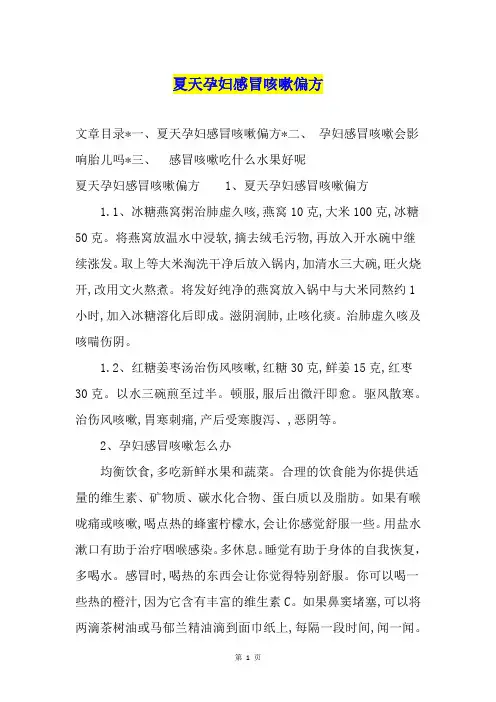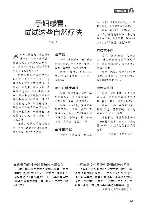 篇一:《孕妇感冒鼻塞的治疗方法》孕妇感冒鼻塞的治疗方法2008-12-03 12:33孕妇感冒了怎么办?感冒是一种常见的多发病,至今尚无特效疗法,目前只能对症处理,让其逐渐自愈。