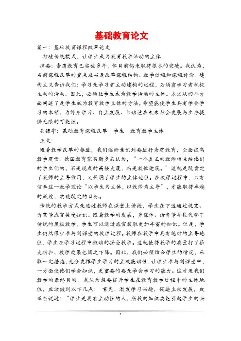 基础教育论文篇一:基础教育课程改革论文打破传统模式,让学生成为教育教学活动的主体摘要:素质教育已实施多年,但目前仍未取得根本的突破。