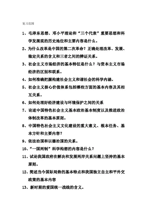 这些都就定了我国必须经过很长的初级阶段才能进入生产力比较发达,社会主义制度比较成熟的阶段第七章一.社会主义市场经济体制的基本特征二.深化分配制度改革①包收入差距原因4点②如何解决贫富差距2点P152三.建设生态文明着力做的4点第八章一.建设中国特色社会主义文化重要性3点二.社会主义核心价值体系的基本内容包括,每一点与核心体系的关系第九章一.坚持党的领导、人民当家做主和依法治国的有机统一答:1.中国共产党的领导是人民当家做主和依法治国的根本保证 2.人民当家做主是社会主义政治的本质和核心要求,是社会主义政治文明建设的根本出发点和归宿,社会主义政治的本质是人民当家做主 3.依法治国是党领导人民治理国家的基本方略。