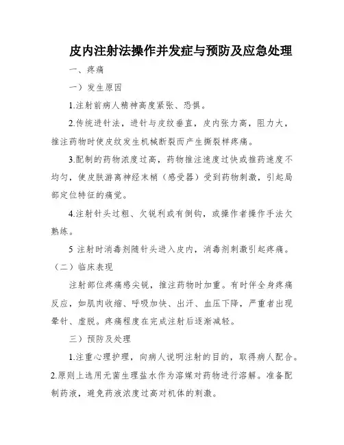 皮内注射法操作常见并发症预防及处理一、疼痛1、原因(1)病人精神紧张、恐惧。