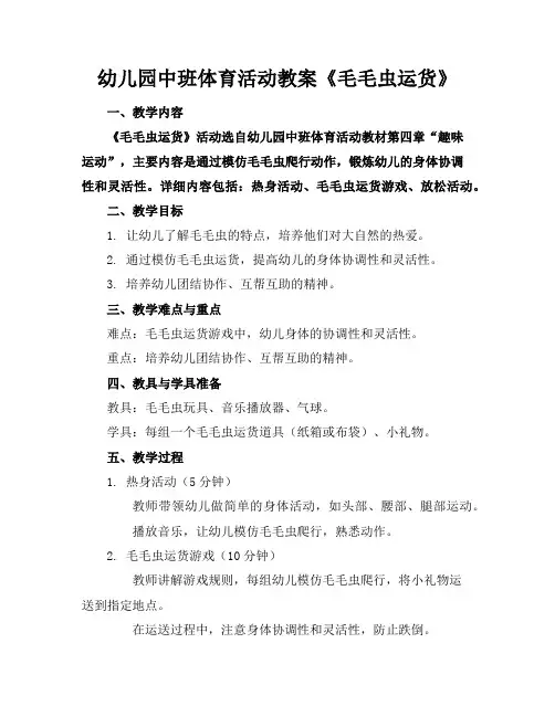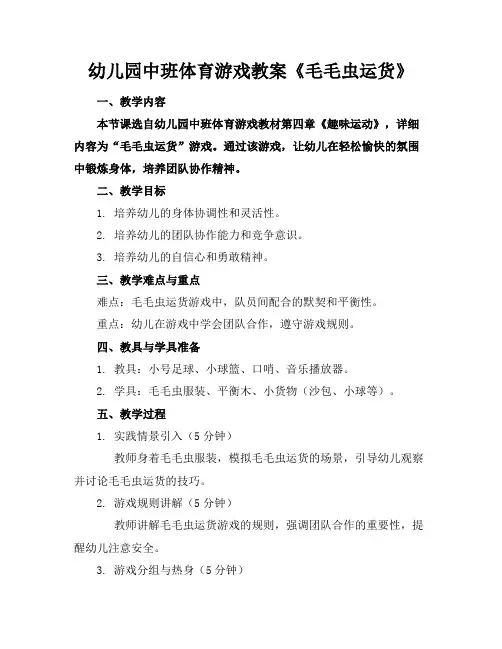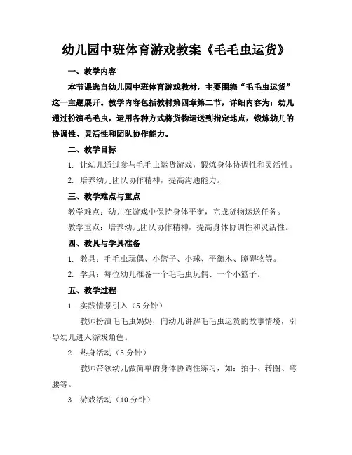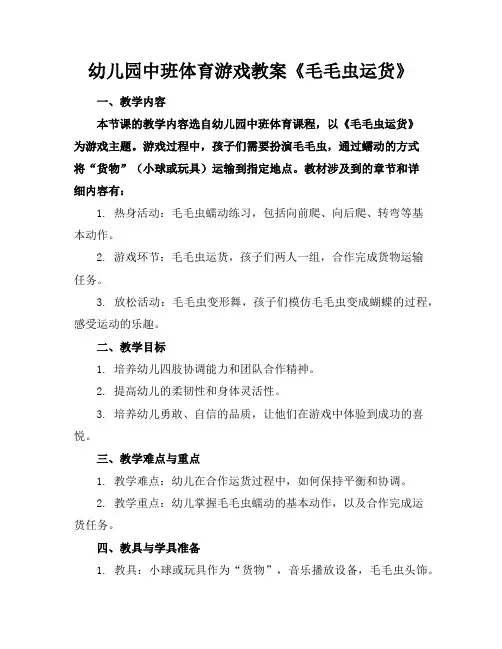 幼儿园中班体育游戏教案《毛毛虫运货》一、教学内容本节课选自幼儿园中班体育游戏教材,主要围绕“毛毛虫运货”这一主题展开。
