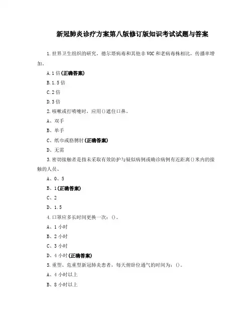 新冠肺炎诊疗方案第八版修订版知识考试试题与答案1.世界卫生组织的研究,德尔塔病毒和其他非VOC和老病毒株相比,传播率增加。