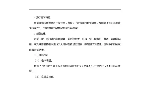 1流行病学特征感染源和传播途径进一步完善,增加了“潜伏期内有传染性,发病后5天内具有较强传染性”,“接触病毒污染物品也可引起感染”2病理变化对肺、脾、肺门淋巴结和骨髓、心脏和血管、肝胆、肾、脑组织、食道、胃和肠黏膜、睾丸等器官和组织进行了大体解剖和显微观察,并分别作了描述。