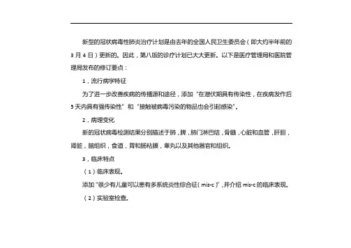 新冠肺炎诊疗方案与修订要点〔试行第八版修订版〕新型冠状病毒肺炎〔新冠肺炎, COVID-19〕为新发急性呼吸道传染病,目前已成为全球性重大的公共卫惹事件。