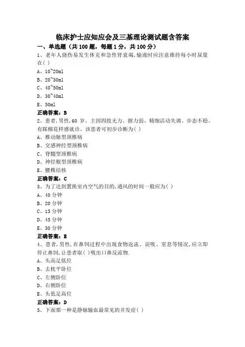 临床护士应知应会及三基理论练习题库(附答案)一、单选题(共100题,每题1分,共100分)1、医疗卫生机构发生医疗废物流失、泄漏、扩散时,应当在多长时间内向所在地的县级人民政府卫生行政主管部门、环境保护行政主管部门报告?( )A、72小时B、48小时C、12小时D、24小时E、8小时正确答案:B2、医务人员手卫生不包括:A、卫生手消毒B、消毒水浸泡双手C、外科洗手D、卫生洗手E、外科手消毒正确答案:B3、下列烧伤的急救原则中,错误的是:A、就地简单保护创面B、立即使用强效广谱抗生素预防感染C、给伤员适当镇静、止痛D、热液烫伤者宜迅速用冷水浸浴E、立即消除烧伤原因正确答案:B4、为病人进行肛门检查时,应协助病人采取的卧位 ( )A、侧卧位B、俯卧位C、头高足低位D、头低足高位E、截石位正确答案:A5、下列哪项不是住院患者健康教育内容( )A、常用急救知识B、一般卫生知识C、检查知识D、医院规章制度E、药物知识正确答案:A6、取血时,认真核对血袋上的( )是否与交叉配血报告单相符A、姓名、性别、年龄、编号、血型等B、姓名、性别、年龄、编号、输血数量等C、姓名、性别、年龄、输血数量、血型等D、姓名、性别、编号、输血数量、血型等E、姓名、年龄、编号、输血数量、血型等正确答案:D7、男性,23岁,双下肢挤压伤,神志尚清楚,表情淡漠,很口渴,面色苍白,皮肤湿冷,脉搏112次/min,血压90/70mmHg。