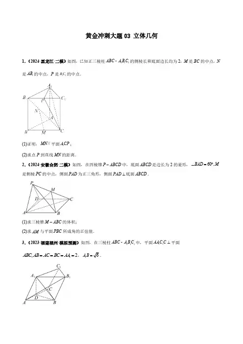 黄金冲刺大题03 立体几何1.(2024·黑龙江·二模)如图,已知正三棱柱111ABC A B C -的侧棱长和底面边长均为2,M 是BC 的中点,N 是1AB 的中点,P 是11B C 的中点.(1)证明://MN 平面1A CP ;(2)求点P 到直线MN 的距离.2.(2024·安徽合肥·二模)如图,在四棱锥P ABCD -中,底面ABCD 是边长为2的菱形,60,BAD M ∠=︒是侧棱PC 的中点,侧面PAD 为正三角形,侧面PAD ⊥底面ABCD .(1)求三棱锥M ABC -的体积;(2)求AM 与平面PBC 所成角的正弦值.3.(2023·福建福州·模拟预测)如图,在三棱柱111ABC A B C -中,平面11AA C C ⊥平面1,2ABC AB AC BC AA ====,1A B =.(1)设D 为AC 中点,证明:AC ⊥平面1A DB ;(2)求平面11A AB 与平面11ACC A 夹角的余弦值.4.(2024·山西晋中·三模)如图,在六面体ABCDE 中,BC BD ==,EC ED ⊥,且EC ED ==AB 平行于平面CDE ,AE 平行于平面BCD ,AE CD ⊥.(1)证明:平面ABE ⊥平面CDE ;(2)若点A 到直线CD 的距离为F 为棱AE 的中点,求平面BDF 与平面BCD 夹角的余弦值.5.(2024·辽宁·二模)棱长均为2的斜三棱柱111ABC A B C -中,1A 在平面ABC 内的射影O 在棱AC 的中点处,P 为棱11A B (包含端点)上的动点.(1)求点P 到平面1ABC 的距离;(2)若AP ⊥平面α,求直线1BC 与平面α所成角的正弦值的取值范围.6.(2024·重庆·模拟预测)在如图所示的四棱锥P -ABCD 中,已知AB CD ∥,90BAD ︒∠=,2CD AB =,PAB 是正三角形,点M 在侧棱PB 上且使得//PD 平面AMC .(1)证明:2PM BM =;(2)若侧面PAB ⊥底面ABCD ,CM 与底面ABCD P AC B --的余弦值.7.(2024·安徽·模拟预测)2023年12月19日至20日,中央农村工作会议在北京召开,习近平主席对“三农”工作作出指示.某地区为响应习近平主席的号召,积极发展特色农业,建设蔬菜大棚.如图所示的七面体ABG CDEHF -是一个放置在地面上的蔬菜大棚钢架,四边形ABCD 是矩形,8AB =m ,4=AD m ,1ED CF ==m ,且ED ,CF 都垂直于平面ABCD ,5GA GB ==m ,HE HF =,平面ABG ⊥平面ABCD .(1)求点H 到平面ABCD 的距离;(2)求平面BFHG 与平面AGHE 所成锐二面角的余弦值.8.(2024·重庆·模拟预测)如图,ACDE 为菱形,2AC BC ==,120ACB ∠=︒,平面ACDE ⊥平面ABC ,点F 在AB 上,且2AF FB =,M ,N 分别在直线CD ,AB 上.(1)求证:CF ⊥平面ACDE ;(2)把与两条异面直线都垂直且相交的直线叫做这两条异面直线的公垂线,若60EAC ∠=︒,MN 为直线CD ,AB 的公垂线,求AN AF的值;(3)记直线BE 与平面ABC 所成角为α,若tan α>BCD 与平面CFD 所成角余弦值的范围.9.(2024·安徽·二模)将正方形ABCD 绕直线AB 逆时针旋转90︒,使得CD 到EF 的位置,得到如图所示的几何体.(1)求证:平面ACF ⊥平面BDE ;(2)点M 为 DF 上一点,若二面角C AM E --的余弦值为13,求MAD ∠.10.(2024·安徽黄山·二模)如图,已知AB 为圆台下底面圆1O 的直径,C 是圆1O 上异于,A B 的点,D 是圆台上底面圆2O 上的点,且平面DAC ⊥平面ABC ,2DA DC AC ===,4BC =,E 是CD 的中点,2BF FD = .(1)证明:2//DO BC ;(2)求直线DB 与平面AEF 所成角的正弦值.11.(2024·黑龙江哈尔滨·一模)正四棱台1111ABCD A B C D -的下底面边长为1112A B AB =,M 为BC 中点,已知点P 满足()1112AP AB AD AA λλλ=-+⋅+ ,其中()0,1λ∈.(1)求证1D P AC ⊥;(2)已知平面1AMC 与平面ABCD 所成角的余弦值为37,当23λ=时,求直线DP 与平面1AMC 所成角的正弦值.12.(2024·辽宁·三模)如图,在三棱柱111ABC A B C -中,侧面11ACC A ⊥底面1,2ABC AC AA ==,1,AB BC =,点E 为线段AC 的中点.(1)求证:1AB 平面1BEC ;(2)若1π3A AC ∠=,求二面角1A BE C --的余弦值.13.(2024·广东广州·一模)如图,在四棱锥P ABCD -中,底面ABCD 是边长为2的菱形,DCP 是等边三角形,π4DCB PCB ∠∠==,点M ,N 分别为DP 和AB 的中点.(1)求证://MN 平面PBC ;(2)求证:平面PBC ⊥平面ABCD ;(3)求CM 与平面PAD 所成角的正弦值.14.(2024·广东梅州·二模)如图,在四棱锥P ABCD -中,平面PAD ⊥平面ABCD ,底面ABCD 为直角梯形,PAD 为等边三角形,//AD BC ,AD AB ⊥,22AD AB BC ===.(1)求证:AD PC ⊥;(2)点N 在棱PC 上运动,求ADN △面积的最小值;(3)点M 为PB 的中点,在棱PC 上找一点Q ,使得//AM 平面BDQ ,求PQ QC的值.15.(2024·广东广州·模拟预测)如图所示,圆台12O O 的轴截面11A ACC 为等腰梯形,111224,AC AA AC B===为底面圆周上异于,A C 的点,且,AB BC P =是线段BC 的中点.(1)求证:1C P //平面1A AB .(2)求平面1A AB 与平面1C CB 夹角的余弦值.16.(2024·广东深圳·二模)如图,三棱柱111ABC A B C -中,侧面11BB C C ⊥底面ABC ,且AB AC =,11A B A C =.(1)证明:1AA ⊥平面ABC ;(2)若12AA BC ==,90BAC ∠=︒,求平面1A BC 与平面11A BC 夹角的余弦值.17.(2024·河北保定·二模)如图,在四棱锥P ABCD -中,平面PCD 内存在一条直线EF 与AB 平行,PA ⊥平面ABCD ,直线PC 与平面ABCD ,PA BC ==,24CD AB ==.(1)证明:四边形ABCD 是直角梯形.(2)若点E 满足2PE ED = ,求二面角P EF B --的正弦值.18.(2024·湖南衡阳·模拟预测)如图,在圆锥PO 中,P 是圆锥的顶点,O 是圆锥底面圆的圆心,AC 是圆锥底面圆的直径,等边三角形ABD 是圆锥底面圆O 的内接三角形,E 是圆锥母线PC 的中点,6,4PO AC ==.(1)求证:平面BED ⊥平面ABD ;(2)设点M 在线段PO 上,且2OM =,求直线DM 与平面ABE 所成角的正弦值.19.(2024·湖南岳阳·三模)已知四棱锥P ABCD -的底面ABCD 是边长为4的菱形,60DAB ∠=︒,PA PC =,PB PD ==M 是线段PC 上的点,且4PC MC = .(1)证明:PC ⊥平面BDM ;(2)点E 在直线DM 上,求BE 与平面ABCD 所成角的最大值.20.(2024·湖南·二模)如图,直四棱柱1111ABCD A B C D -的底面是边长为2的菱形,160,ABC BD ∠=⊥ 平面11AC D .(1)求四棱柱1111ABCD A B C D -的体积;(2)设点1D 关于平面11AC D 的对称点为E ,点E 和点1C 关于平面α对称(E 和α未在图中标出),求平面11AC D 与平面α所成锐二面角的大小.21.(2024·山东济南·二模)如图,在