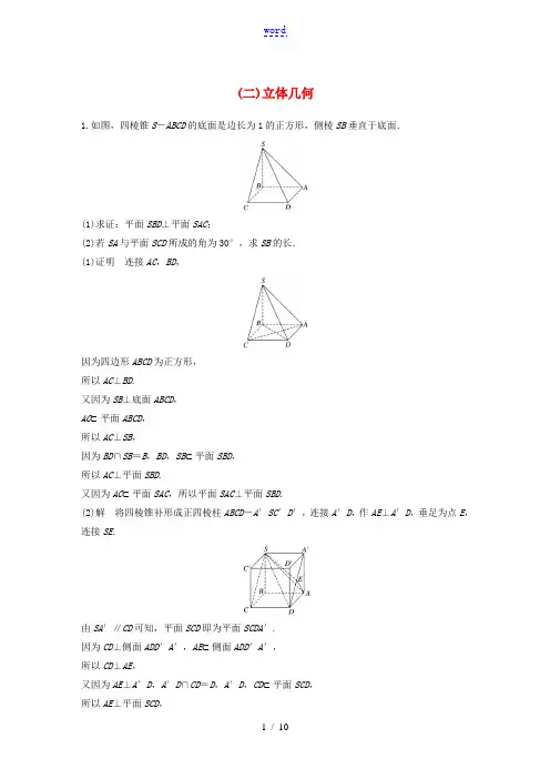 (二)立体几何1.如图,四棱锥S-ABCD的底面是边长为1的正方形,侧棱SB垂直于底面.(1)求证:平面SBD⊥平面SAC;(2)若SA与平面SCD所成的角为30°,求SB的长.(1)证明连接AC,BD,因为四边形ABCD为正方形,所以AC⊥BD.又因为SB⊥底面ABCD,AC⊂平面ABCD,所以AC⊥SB,因为BD∩SB=B,BD,SB⊂平面SBD,所以AC⊥平面SBD.又因为AC⊂平面SAC,所以平面SAC⊥平面SBD.(2)解将四棱锥补形成正四棱柱ABCD-A′SC′D′,连接A′D,作AE⊥A′D,垂足为点E,连接SE.由SA′∥CD可知,平面SCD即为平面SCDA′.因为CD⊥侧面ADD′A′,AE⊂侧面ADD′A′,所以CD⊥AE,又因为AE⊥A′D,A′D∩CD=D,A′D,CD⊂平面SCD,所以AE⊥平面SCD,于是∠ASE 即为SA 与平面SCD 所成的角. 设SB =x ,在Rt△ABS 中,SA =1+x 2, 在Rt△DAA ′中,AE =x1+x2.因为∠ASE =30°,所以1+x 2=2x 1+x2,解得x =1,即SB 的长为1.2.(2019·某某模拟)如图,棱锥P -ABCD 的底面是菱形,AB =2,∠DAB =π3,侧面PAB 垂直于底面ABCD ,且△PAB 是正三角形.(1)求证:PD ⊥AB ;(2)求直线PC 与平面PBD 所成角的正弦值. (1)证明 取AB 的中点O ,连接OD ,OP , 由题意知,△ABD 为等边三角形, 所以AB ⊥OD ,又△PAB 是等边三角形, 所以AB ⊥OP ,又OP ∩OD =O ,OP ,OD ⊂平面POD , 所以AB ⊥平面POD ,又PD ⊂平面POD ,所以PD ⊥AB .(2)解 方法一 如图,由(1)知,PO ⊥AB ,PO ⊂平面PAB ,平面PAB ∩平面ABCD =AB ,平面PAB ⊥平面ABCD ,所以PO ⊥平面ABCD ,以O 为原点,OB 所在直线为x 轴,OD 所在直线为y 轴,OP 所在直线为z 轴,建立空间直角坐标系,则P (0,0,3),B (1,0,0),C (2,3,0),D (0,3,0), BD →=(-1,3,0),PD →=(0,3,-3), PC →=(2,3,-3).设平面PBD 的一个法向量为n =(x ,y ,z ),则⎩⎪⎨⎪⎧n ·BD →=0,n ·PD →=0,即⎩⎨⎧-x +3y =0,3y -3z =0,取y =1,得x =3,z =1,即n =(3,1,1), 设直线PC 与平面PBD 所成角为θ, 则sin θ=|cos 〈n ,PC →〉|=2310×5=65, 所以直线PC 与平面PBD 所成角的正弦值为65. 方法二 设点C 到平面PBD 的距离为h , 直线PC 与平面PBD 所成的角是θ, 则sin θ=h PC.同方法一得,PO ⊥平面ABCD ,PD =PO 2+DO 2=6,又PB =2,BD =2,所以cos∠PBD =BD 2+PB 2-PD 22BD ·PB =14,所以sin∠PBD =154, 所以S △PBD =12PB ·BD ·sin∠PBD =152,由V C -PBD =V P -BCD , 即13S △PBD ·h =13S △BCD ·PO , 得13·152·h =13·3·3,h =2155, 又PD ⊥AB ,AB ∥CD ,所以PD ⊥CD ,所以PC =PD 2+CD 2=10,所以sin θ=h PC =65. 所以直线PC 与平面PBD 所成角的正弦值为65. 3.(2019·某某十四中月考)如图,三棱柱ABC —A 1B 1C 1所有的棱长均为2,A 1B =6,A 1B ⊥AC .(1)求证:A 1C 1⊥B 1C ;(2)求直线AC和平面ABB1A1所成角的余弦值.(1)证明方法一取AC的中点O,连接A1O,BO,则BO⊥AC,∵A1B⊥AC,A1B∩BO=B,A1B⊂平面A1BO,BO⊂平面A1BO,∴AC⊥平面A1BO,连接AB1交A1B于点M,连接OM,则B1C∥OM,又OM⊂平面A1BO,∴AC⊥OM,∴AC⊥B1C,∵A1C1∥AC,∴A1C1⊥B1C.方法二连接AB1,BC1,∵四边形A1ABB1是菱形,∴A1B⊥AB1,又∵A1B⊥AC,AB1∩AC=A,AB1⊂平面AB1C,AC⊂平面AB1C,∴A1B⊥平面AB1C,又B1C⊂平面AB1C,∴A1B⊥B1C,又四边形B1BCC1是菱形,∴BC1⊥B1C,又A1B∩BC1=B,∴B1C⊥平面A1BC1,∴B1C⊥A1C1.(2)解∵A1B⊥AB1,A1B⊥AC,AB1∩AC=A,AB1,AC⊂平面AB1C,∴A1B⊥平面AB1C,又A1B⊂平面ABB1A1,∴平面AB1C⊥平面ABB1A1,∵平面AB1C∩平面ABB1A1=AB1,∴AC在平面ABB1A1内的射影为AB1,∴∠B1AC为直线AC和平面ABB1A1所成的角,由(1)知A1C1⊥B1C,又A1C1∥AC,∴B 1C ⊥AC ,∵AB 1=2AM =2AB 2-BM 2=10, ∴在Rt△ACB 1中, cos∠B 1AC =AC AB 1=210=105, ∴直线AC 和平面ABB 1A 1所成角的余弦值为105. 4.(2019·浙南联盟模拟)在三棱台ABC -A 1B 1C 1中,△ABC 是等边三角形,二面角A -BC -B 1的平面角为60°,BB 1=CC 1.(1)求证:A 1A ⊥BC ;(2)求直线AB 与平面BCC 1B 1所成角的正弦值.(1)证明 延长AA 1,BB 1,CC 1交于点S ,取棱BC 的中点O ,连接AO ,SO .因为BB 1=CC 1,B 1C 1∥BC , 故SB =SC .又O 是棱BC 的中点, 故BC ⊥SO .因为AB =AC ,所以BC ⊥AO ,又SO ,AO ⊂平面SAO ,且SO ∩AO =O , 因此BC ⊥平面SAO , 又A 1A ⊂平面SAO , 所以A 1A ⊥BC .(2)解 方法一 由(1)知,∠AOS 为二面角A -BC -B 1的平面角,即∠AOS =60°, 作AH ⊥SO ,垂足为H ,连接BH .因为BC ⊥平面SAO ,AH ⊂平面SAO ,所以BC ⊥AH , 又SO ∩BC =O ,SO ,BC ⊂平面BCC 1B 1,故AH ⊥平面BCC 1B 1,从而∠ABH 为直线AB 与平面BCC 1B 1所成的角. 不妨设AB =2,则AO =3,AH =AO sin∠AOS =32,所以sin∠ABH =AH AB =34.方法二 如图,以O 为原点,OA ,OB 所在直线为x 轴,y 轴,过点O 且垂直于平面ABC 的直线为z 轴,建立空间直角坐标系O -xyz ,由(1),∠AOS 为二面角A -BC -B 1的平面角, 则∠AOS =60°, 设BC =2,SO =a (a >0),则点A (3,0,0),B (0,1,0),C (0,-1,0),S ⎝ ⎛⎭⎪⎫a2,0,32a .所以AB →=(-3,1,0),CB →=(0,2,0),OS →=⎝ ⎛⎭⎪⎫a2,0,32a ,设n =(x ,y ,z )为平面BCC 1B 1的一个法向量, 由⎩⎪⎨⎪⎧n ·CB →=0,n ·OS →=0,得⎩⎪⎨⎪⎧2y =0,a 2x +32a ·z =0,令x =3,则z =-1, 即n =(3,0,-1).设θ是直线AB 与平面BCC 1B 1所成的角, 则sin θ=|cos 〈AB →,n 〉|=|AB →·n ||AB →||n |=34.5.在如图所示的几何体中,EA ⊥平面ABC ,DB ⊥平面ABC ,AC ⊥BC ,且AC =BC =BD =2AE ,M 是AB 的中点.(1)求证:CM ⊥EM ;(2)求CM 与平面CDE 所成的角.方法一 (1)证明 因为AC =BC ,M 是AB 的中点, 所以CM ⊥AB .又EA ⊥平面ABC ,CM ⊂平面ABC ,所以EA ⊥CM , 因为AB ∩EA =A ,AB ,EA ⊂平面ABDE , 所以CM ⊥平面ABDE ,又因为EM ⊂平面ABDE ,所以CM ⊥EM .(2)解 过点M 作MH ⊥平面CDE ,垂足为H ,连接CH 并延长交ED 于点F ,连接MF ,MD ,则∠FCM 是直线CM 和平面CDE 所成的角.因为MH ⊥平面CDE ,ED ,MF ⊂平面CDE ,所以MH ⊥ED ,MF ⊥CM , 又因为CM ⊥平面EDM ,ED ⊂平面EDM , 所以CM ⊥ED ,因为MH ∩CM =M ,MH ,CM ⊂平面CMF , 所以ED ⊥平面CMF ,因为MF ⊂平面CMF ,所以ED ⊥MF . 设EA =a ,则BD =BC =AC =2a , 所以在Rt△ABC 中,AB =22a ,M 是