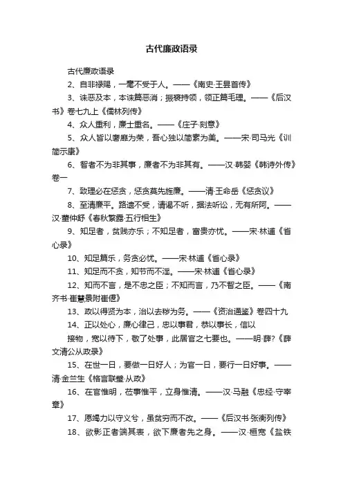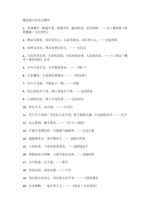 中国古代廉政格言警句1. 廉则居民爱,贪则居民弃。