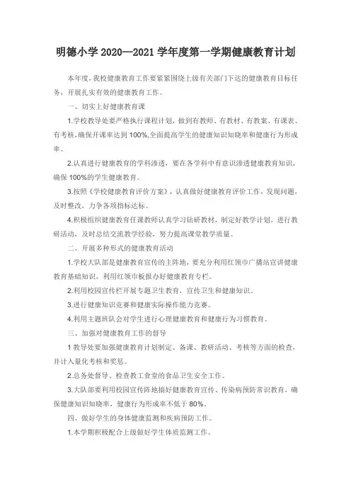 明德小学2020—2021学年度第一学期健康教育计划本年度,我校健康教育工作要紧紧围绕上级有关部门下达的健康教育目标任务,开展扎实有效的健康教育工作。