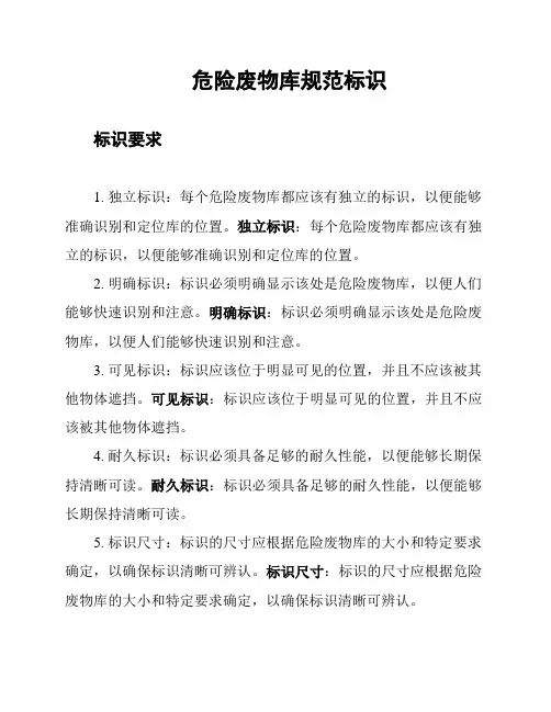 危险废物库规范标识标识要求1. 独立标识:每个危险废物库都应该有独立的标识,以便能够准确识别和定位库的位置。