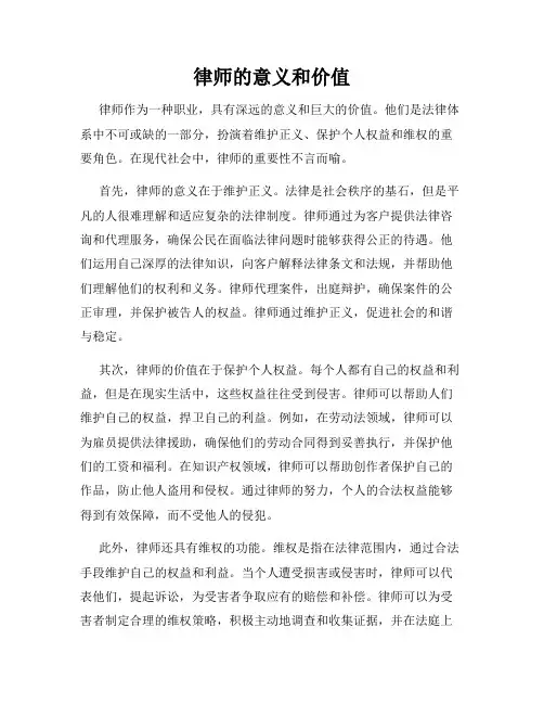 二、个人意义1. 实现自我价值成为律师需要经过长时间的学习和实践,只有经过不断的努力才能够成为一名合格的律师。