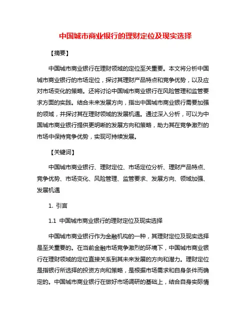 【关键词】中国城市商业银行、理财定位、市场定位分析、理财产品特点、竞争优势、市场变化、风险管理、监管要求、发展方向、领域加强、发展机遇1. 引言1.1 中国城市商业银行的理财定位及现实选择中国城市商业银行作为金融机构的一种,其理财定位及现实选择是至关重要的。