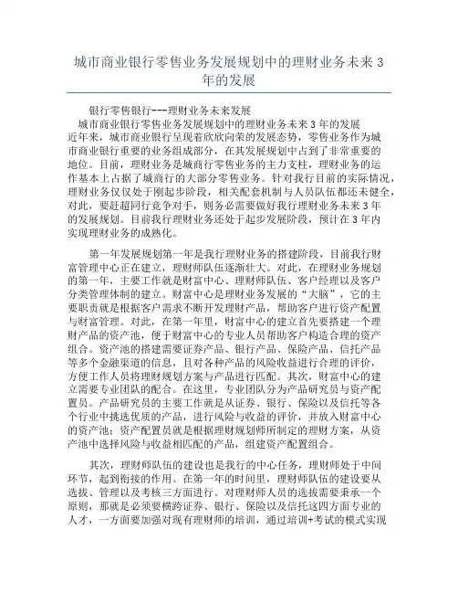 城市商业银行零售业务发展规划中的理财业务未来3年的发展银行零售银行---理财业务未来发展城市商业银行零售业务发展规划中的理财业务未来3年的发展近年来,城市商业银行呈现着欣欣向荣的发展态势,零售业务作为城市商业银行重要的业务组成部分,在其发展规划中占到了非常重要的地位。