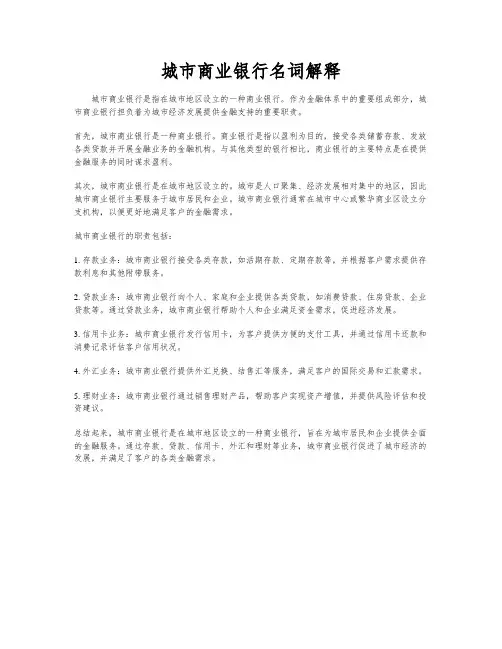 总结起来,城市商业银行是在城市地区设立的一种商业银行,旨在为城市居民和企业提供全面的金融服务。
