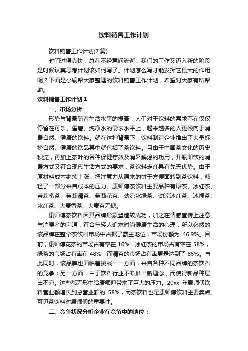 饮料销售计划篇一一、市场分析一、形势与背景随着生活水平的提高,人们对于饮料的需求不在仅仅停留在可乐、雪碧、纯净水的需求水平上,越来越多的人更倾向于消费自然、健康的饮料。