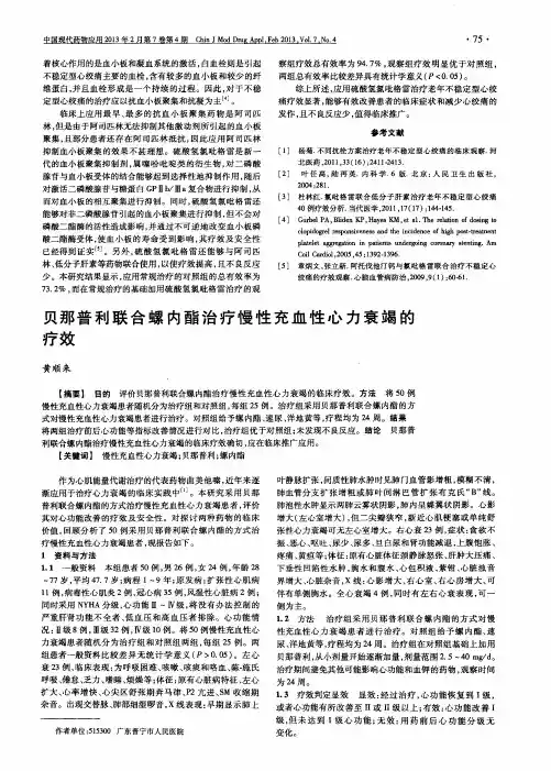 3. β受体阻断剂β受体阻断剂是另一类广泛使用的抗心衰药物,通过阻断β受体的作用,降低心脏的负荷和节律,减慢心脏收缩速率,增加心肌的舒张期,改善心脏功能。