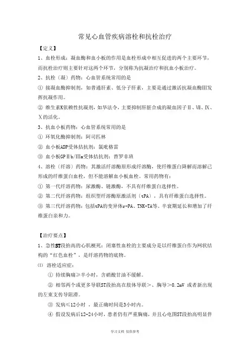 3、抗血小板药物:心血管系统常用的是①环氧化酶抑制剂:阿司匹林②血小板ADP受体拮抗剂:氯吡格雷③血小板GPⅡb/Ⅲa受体拮抗剂:替罗非班4、溶栓〔纤溶〕药物:其激活纤溶酶原形成纤溶酶,使纤维蛋白降解而溶解已形成的纤维蛋白血栓,但不能溶解血小板血栓。