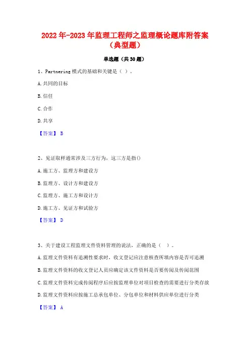 2022年-2023年监理工程师之监理概论题库附答案(典型题)单选题(共30题)1、Partnering模式的基础和关键是()。