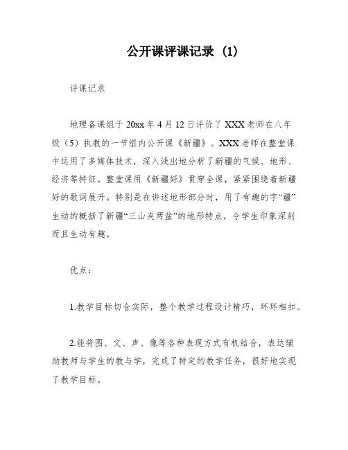 公开课评议记录时间:20XX年X月X日地点:XXXX学校主持人:XXX一、公开课概述本次公开课是为了提高教师的教学质量,促进教育教学改革而举办的。