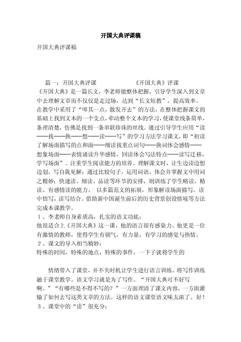 开国大典评课稿开国大典评课稿篇一:开国大典评课《开国大典》评课《开国大典》是一篇长文,李老师能整体把握,引导学生深入到文章中去理解文章而不仅仅是走过场,达到“长文短教”,提高效率。