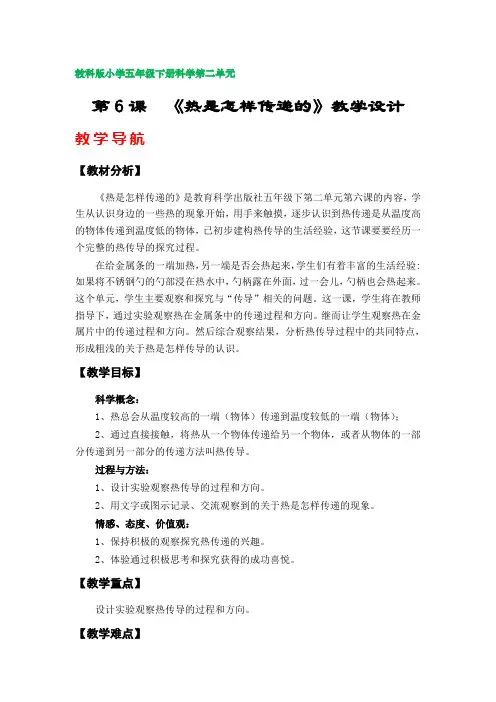 教科版五年级科学下册第二单元《2.6热是怎样传递的》教学设计一. 教材分析《2.6热是怎样传递的》这一课主要让学生了解和掌握热传递的概念、方式以及热传递在实际生活中的应用。