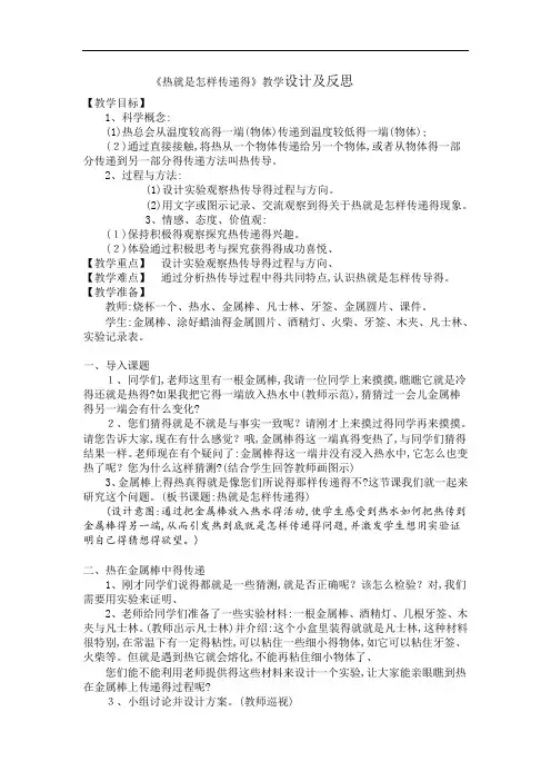 师:你觉得热在勺子里是怎么传递的呢?师板书:热是怎样传递的生:我觉得热水先把热传给勺部,再传给勺柄。
