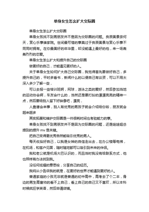 单身女生怎么扩大交际圈单身女生怎么扩大交际圈单身女孩找不到男朋友并不是因为交际圈的问题。