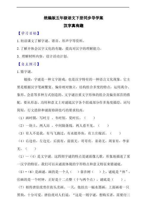 统编版五年级语文下册同步导学案汉字真有趣【学习目标】1.初读课文了解字谜、谐音、形声字等资料。