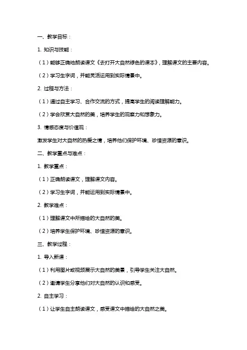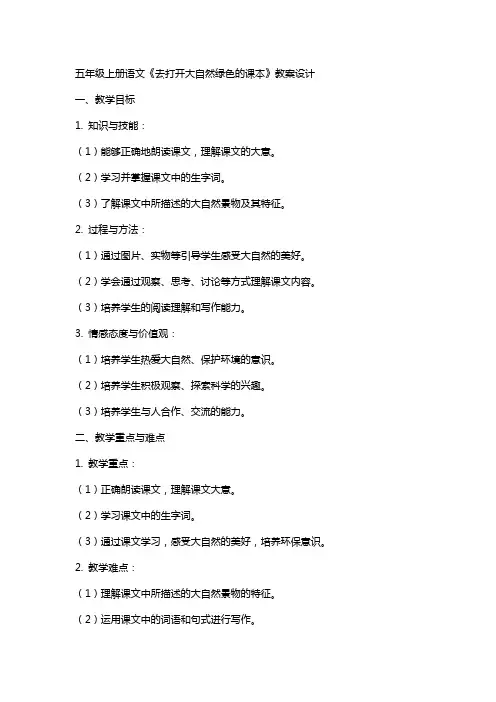 五年级上册语文《去打开大自然绿色的课本》教案设计一、教学目标1. 知识与技能:(1)能够正确地朗读课文,理解课文的大意。