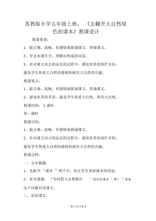 苏教版小学五年级上册语文《去打开大自然绿色的课本》教案三篇篇一教学目的:1.学会本课生字新词,理解由生字组成的新词。