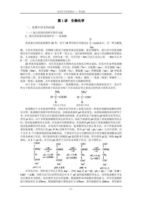 第1讲生物化学一、竞赛中涉及的问题(一)蛋白质的结构和生物学功能1.蛋白质的基本组成单位——氨基酸组成蛋白质的氨基酸有20种,其中19种结构可用通式表示。