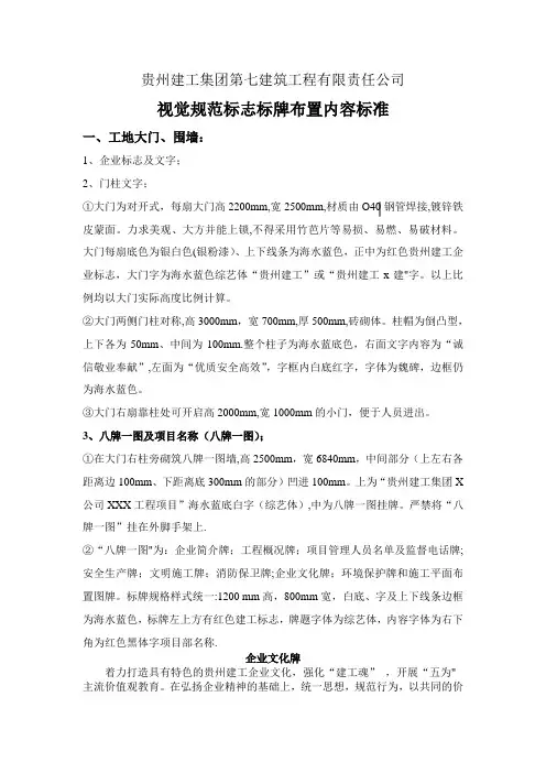 贵州建工集团第七建筑工程有限责任公司视觉规范标志标牌布置内容标准一、工地大门、围墙:1、企业标志及文字;2、门柱文字;①大门为对开式,每扇大门高2200mm,宽2500mm,材质由O40钢管焊接,镀锌铁皮蒙面。