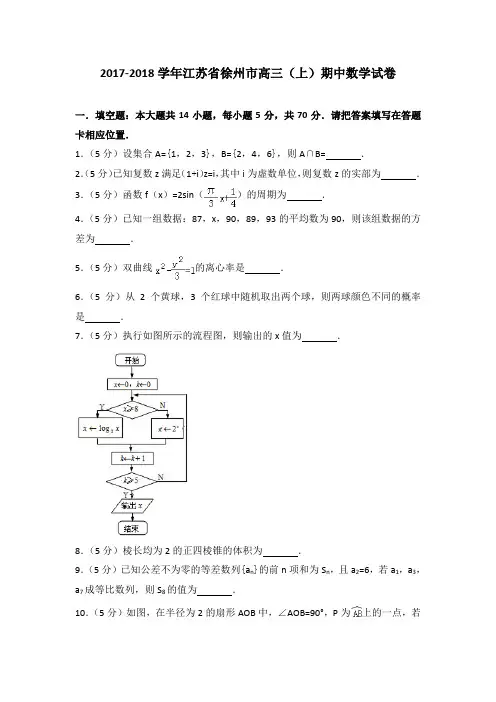 2017-2018学年江苏省徐州市高三(上)期中数学试卷一.填空题:本大题共14小题,每小题5分,共70分.请把答案填写在答题卡相应位置.1.(5分)设集合A={1,2,3},B={2,4,6},则A∩B=.2.(5分)已知复数z满足(1+i)z=i,其中i为虚数单位,则复数z的实部为.3.(5分)函数f(x)=2sin()的周期为.4.(5分)已知一组数据:87,x,90,89,93的平均数为90,则该组数据的方差为.5.(5分)双曲线的离心率是.6.(5分)从2个黄球,3个红球中随机取出两个球,则两球颜色不同的概率是.7.(5分)执行如图所示的流程图,则输出的x值为.8.(5分)棱长均为2的正四棱锥的体积为.9.(5分)已知公差不为零的等差数列{a n}的前n项和为S n,且a2=6,若a1,a3,a7成等比数列,则S8的值为.10.(5分)如图,在半径为2的扇形AOB中,∠AOB=90°,P为上的一点,若=2,则的值为.11.(5分)已知函数f(x)=e x﹣e﹣x+1(e为自然对数的底数),若f(2x﹣1)+f (4﹣x2)>2,则实数x的取值范围为.12.(5分)已知实数x,y满足x2+y2=3,|x|≠|y|,则的最小值为.13.(5分)已知点P是圆O:x2+y2=4上的动点,点A(4,0),若直线y=kx+1上总存在点Q,使点Q恰是线段AP的中点,则实数k的取值范围为.14.(5分)已知函数f(x)=x3﹣x2﹣2a,若存在x0∈(﹣∞,a],使f(x0)≥0,则实数a的取值范围为.二.解答题:本大题共6小题,共计90分.请在答题卡指定区域内作答,解答时应写出文字说明、证明过程或计算步骤.15.(14分)已知△ABC的内角A,B,C所对的边分别为a,b,c且a+2c=2bcosA.(1)求角B的大小;(2)若b=2,a+c=4,求△ABC的面积.16.(14分)如图,在三棱锥S﹣ABC中,SA=SC,AB⊥AC,D为BC的中点,E 为AC上一点,且DE∥平面SAB.求证:(1)直线AB∥平面SDE;(2)平面ABC⊥平面SDE.17.(14分)如图,有一块半圆形空地,开发商计划建一个矩形游泳池ABCD及其矩形附属设施EFGH,并将剩余空地进行绿化,园林局要求绿化面积应最大化.其中半圆的圆心为O,半径为R,矩形的一边AB在直径上,点C,D,G,H 在圆周上,E,F在边CD上,且,设∠BOC=θ.(1)记游泳池及其附属设施的占地面积为f(θ),求f(θ)的表达式;(2)怎样设计才能符合园林局的要求?18.(16分)如图,在平面直角坐标系xOy中,椭圆E:=1(a>b>0)的左顶点为A(﹣2,0),离心率为,过点A的直线l与椭圆E交于另一点B,点C为y轴上的一点.(1)求椭圆E的标准方程;(2)若△ABC是以点C为直角顶点的等腰直角三角形,求直线l的方程.19.(16分)已知数列{a n}的前n项和为S n,满足S n=2a n﹣1,n∈N*.数列{b n}满足nb n﹣(n+1)b n=n(n+1),n∈N*,且b1=1.+1(1)求数列{a n}和{b n}的通项公式;(2)若c n=a n,数列{c n}的前n项和为T n,对任意的n∈N*,都有T n<nS n ﹣a,求实数a的取值范围;(3)是否存在正整数m,n使b1,a m,b n(n>1)成等差数列,若存在,求出所有满足条件的m,n,若不存在,请说明理由.20.(16分)已知函数f(x)=(ax﹣1)e x(a≠0,e是自然对数的底数).(1)若函数f(x)在区间[1,2]上是单调减函数,求实数a的取值范围;(2)求函数f(x)的极值;(3)设函数f(x)图象上任意一点处的切线为l,求l在x轴上的截距的取值范围.【选做题】请从21.22.23.24选定其中两小题,并在相应的答题区域内作答,若多做,则按作答的前两小题评分.解答时应写出文字说明、证明过程或演算步骤.[选修4-1:几何证明选讲]21.(10分)如图,CD是圆O的切线,切点为D,CA是过圆心O的割线且交圆O于B点,过B作圆O的切线交CD于点E,DE=.求证:CA=.[选修4-2:矩阵与变换]22.(10分)已知矩阵A=,若直线y=kx+1在矩阵A对应的变换作用下得到的直线过点P(2,6),求实数k的值.[选修4-4:坐标系与参数方程]23.在极坐标系中,圆C的方程为ρ=2acosθ(a>0),以极点为坐标原点,极轴为x轴正半轴建立平面直角坐标系,设直线l的参数方程为(t为参数),若直线l与圆C恒有公共点,求实数a的取值范围.[选修4-5:不等式选讲]24.设x,y均为正数,且x>y,求证:2(x﹣y﹣1)+≥1.【必做题】第25题、第26题,每题10分,共计20分.请在答题卡指定区域内作答,解答时应写出文字说明、证明过程或演算步骤.25.(10分)如图,在三棱锥A﹣BOC中,OA,OB,OC两两垂直,点D,E分别为棱BC,AC的中点,F在棱AO上,且满足OF=,已知OA=OC=4,OB=2.(1)求异面直线AD与OC所成角的余弦值;(2)求二面角C﹣EF﹣D的正弦值.26.(10分)某同学在上学路上要经过A、B、C三个带有红绿灯的路口.已知他在A、B、C三个路口遇到红灯的概率依次是、、,遇到红灯时停留的时间依次是40秒、20秒、80秒,且在各路口是否遇到红灯是相互独立的.(1)求这名同学在上学路上在第三个路口首次遇到红灯的概率;,(2)求这名同学在上学路上因遇到红灯停留的总时间.2017-2018学年江苏省徐州市高三(上)期中数学试卷参考答案与试题解析一.填空题:本大题共14小题,每小题5分,共70分.请把答案填写在答题卡相应位置.1.(5分)设集合A={1,2,3},B={2,4,6},则A∩B={2} .【解答】解:由集合A={1,2,3},B={2,4,6},所以A∩B={1,2,3}∩{2,4,6}={2}.故答案为{2}.2.(5分)已知复数z满足(1+i)z=i,其中i为虚数单位,则复数z的实部为.【解答】解:∵(1+i)z=i,∴z====+i,∴复数z的实部为,故答案为:3.(5分)函数f(x)=2sin()的周期为6.【解答】解:函数f(x)=2sin()的周期为=6,故答案为:6.4.(5分)已知一组数据:87,x,90,89,93的平均数为90,则该组数据的方差为4.【解答】解:数据:87,x,90,89,93的平均数为90,则=×(87+x+90+89+93)=90,解得x=91,∴该组数据的方差为s2=×[(87﹣90)2+(91﹣90)2+(90﹣90)2+(89﹣90)2+(93﹣90)2]=4.故答案为:4.5.(5分)双曲线的离心率是2.【解答】解:∵双曲线中,a2=1且b2=3∴a=1,b=,可得c==2因此双曲线的离心率e==2故答案为:26.(5分)从2个黄球,3个红球中随机取出两个球,则两球颜色不同的概率是.【解答】解:从袋中随机取两个球,所有的取法共有=10种,而取出的两个球颜色不