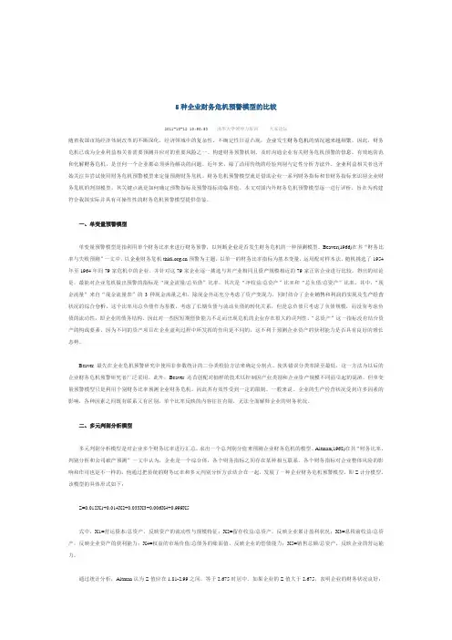 5种企业财务危机预警模型的比较2011-10-12 10:50:53 清华大学领导力培训大家论坛随着我国市场经济体制改革的不断深化,经济领域中的复杂性、不确定性日益凸现,企业发生财务危机的情况越来越频繁,因此,财务危机已成为企业利益相关者需要预测并应对的重要风险之一。