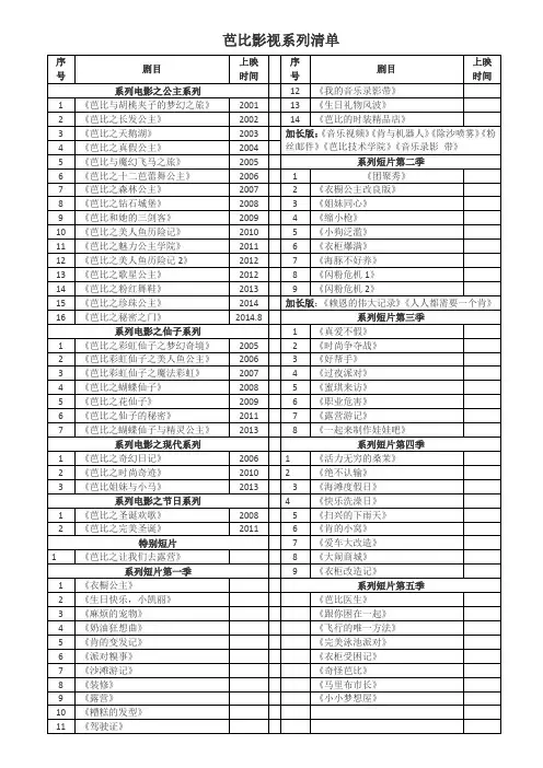 芭比娃娃(系列电影)芭比娃娃系列电影(动画片)有很多部,上映时间不一,包括童话公主系列、仙子系列、现代系列、假日系列等。