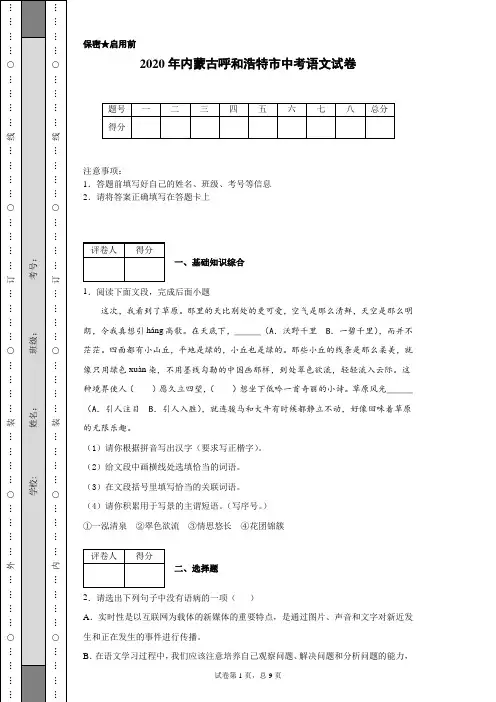 内蒙古呼和浩特市2020年中考语文试题学校:___________姓名:___________班级:___________考号:___________一、基础知识综合1.阅读下面文段,完成后面小题这次,我看到了草原。