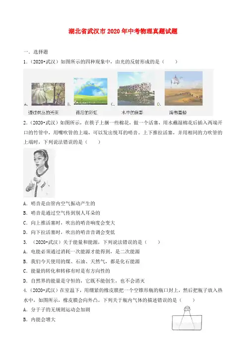 上下推拉活塞,并用相同的力吹管的上端时,下列说法错误的是()A.哨音是由管内空气振动产生的B.哨音是通过空气传到别人耳朵的C.向上推活塞时,吹出的哨音响度会变大D.向下拉活塞时,吹出的哨音音调会变低3. (2020•武汉)关于能量和能源,下列说法错误的是()A.电能必须通过消耗一次能源才能得到,是二次能源B.我们今天使用的煤、石油、天然气,都是化石能源C.能量的转化和转移有时是有方向性的D.自然界的能量是守恒的,它既不能创生,也不会消灭4.(2020•武汉)在室温下,用绷紧的橡皮膜把一个空锥形瓶的瓶口封上,然后把瓶子放入热水中,如图所示,橡皮膜会向外凸。