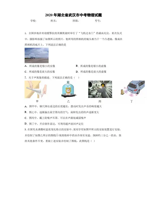 2020年湖北武汉中考物理试卷(解析版)一、单选题(本大题共12小题,每小题3分,共36分)1.全国多地在欢迎援鄂抗疫英雄凯旋时举行了“飞机过水门”的最高礼仪.某次仪式中,摄影师拍摄了如图所示的照片,他所用的照相机的镜头相当于一个凸透镜,像成在照相机的底片上,下列说法正确的是( )A.所成的像是缩小的实像B.所成的像是缩小的虚像C.所成的像是放大的实像D.所成的像是放大的虚像2.关于声现象的描述,下列说法正确的是( )A.图甲中,钢尺伸出桌边的长度越长,拨动时发出声音的响度越大B.图乙中,逐渐抽出真空罩内的空气,闹钟发出的铃声逐渐变大C.图丙中,戴上防噪声耳罩,可以在声源处减弱噪声D.图丁中,开启倒车雷达,可利用超声波回声定位3.在探究水沸腾时温度变化特点的实验中,某同学用如图甲所示的实验装置进行实验,并绘制了如图乙所示的图线①,现将烧杯中的水冷却至室温,倒掉约三分之一的水,保持其他条件不变,重做上述实验并绘制了图线,此图线是( )A.①B.②C.③D.④4.关于能源,下列说法正确的是( )A.电能、地热能都是一次能源B.风能、水能、太阳能都是不可再生能源C.核反应堆中发生的链式反应,是可以控制的D.大量氢核的裂变,可以在瞬间释放出巨大的核能5.如图所示,将一把铁锁用绳子悬挂起来,把它拉到自己的鼻子附近,松手后铁锁来回摆动.下列说法正确的是( )A.摆动过程中,绳子对铁锁的拉力和铁锁对绳子的拉力是一对平衡力B.摆动过程中,铁锁的运动状态一定发生变化C.摆动过程中,绳子一定发生塑性形变D.若绳子突然断开,铁锁将做匀速直线运动6.铁块和小桌静止在海绵上,如图甲所示.撤掉小桌后,铁块再次静止在海绵上,如图乙所示.铁块的质量是,铁块的底面积是,小桌的质量是,桌面的面积是,下列说法正确的是()A.图甲中,铁块对小桌的压强比小桌对海绵的压强大B.图甲中,铁块对小桌的压强比小桌对海绵的压强小C.图甲中铁块对小桌的压强比图乙中铁块对海绵的压强大D.图甲中铁块对小桌的压强比图乙中铁块对海绵的压强小7.一个质量分布均匀的正方体物块,边长是,密度是,漂浮在液面上,露出液面的体积占物块体积的.用手缓慢下压物块,如图所示,当物块上表面与液面刚好相平时,下列说法错误的是( )A.液体的密度是B.手对物块上表面的压力大小是C.液体对物块下表面的压力大小是D.物块下表面受到液体的压强是8.滑跃式起飞是一种航母舰载机的起飞方式.飞机跑道的前一部分是水平的,跑道尾段向上翘起.如图所示,飞行员驾驶舰载机从图示位置由静止开始一直加速直至离舰的过程中,下列说法正确的是( )A.飞行员的动能先增加后减少B.飞行员的机械能一直减少C.飞行员的机械能一直增加D.飞行员的机械能先不变后增加9.如图所示是一种温度自动报警器的原理图.制作水银温度计时,在玻璃管的两端分别封入一段金属丝.电池的两极分别与金属丝相连,当温度达到与电池正极相连的金属丝下端所指的温度时,电铃就响起来,发出报警信号.下列说法正确的是( )A.温度计中的水银是绝缘体B.电铃响时,电磁铁右端是极C.温度降低到以下,电铃响铃D.电铃响且滑片向左移动时,电磁铁磁性减弱10.如图所示是现在一般标准住宅户内配电系统方框图.下列说法正确的是( )A.电能表用来计量家中所有用电器的总功率B.空调正常工作时,吊灯一定发光C.如果插座被短路,“漏电保护器”就会切断电流D.空气开关“跳闸”,可能是电路发生短路引起的11.如图所示,电源电压保持不变,滑动变阻器的滑片在最右端.闭合开关,断开开关,滑片移至中点附近时,电流表的示数是;保持滑片不动,闭合开关,断开开关时,电流表的示数是,则电阻的阻值是( )A.B.C.D.12.如图甲所示的电路中,电源电压保持不变,灯泡的图象如图乙所示.当只闭合开关,滑动变阻器的滑片在最右端时,电压表的示数是,电流表的示数是;当只闭合开关、,滑片在最左端时,电流表的示数是;当只闭合开关、,滑片在中点时,电压表的示数是,电流表的示数是.已知,.当滑片在最左端时,通过开关通断,可使电路消耗的功率最大,该最大值是( )甲乙A.B.C.D.二、非选择题(1)(2)13.年月日,我国北斗三号全球卫星导航系统的最后一颗组网卫星成功发射,能为全球提供导航、定位、授时和短报文等服务.北斗卫星之间利用 (填“次声波”、“电磁波”或“超声波”)相互传递信息,实现“星间链路”.“北斗”让天地互通更加智慧.在某公交车站,一同学从电子站牌上看到一辆公交车需要用时分钟行驶千米才能到达某站,由此他预测该车的速度是 千米小时,该车实际上提前秒到达此站,它的行驶速度是 (结果保留两位小数)米/秒.(1)14.在探究影响滑动摩擦力大小的因素的实验中,某同学所用器材如图甲所示,其中长木板的表面比的表面更粗糙,物块各表面的粗糙程度均相同,它的长、宽和高分别是、和.将物块放在水平放置的长木板上,再把砝码放在物块上,用弹簧测力计水平拉动物块,沿长木板做匀速直线运动,实验记录如下表:实验次数物块放置情况接触面压力情况弹簧测力计示数1平放一物块的砝码放在物块上2平放一物块的砝码放在物块上3平放一物块的砝码放在物块上4侧放一物块的砝码放在物块上第1次实验中,弹簧测力计示数如图乙所示,该示数是 .(2)(3)由1、2两次实验可知:压力相同时,物块与长木板的接触面越粗糙,物块受到的滑动摩擦力 (填“