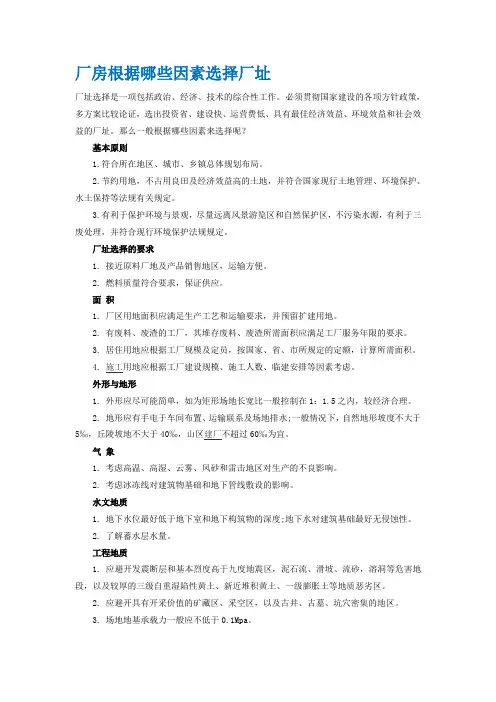 厂址选择的一般原则选择合适的厂址应考虑以下几个方面:地理位置厂址的地理位置应考虑交通便利性,与供应链和销售市场的距离,是否有足够的土地面积等因素。