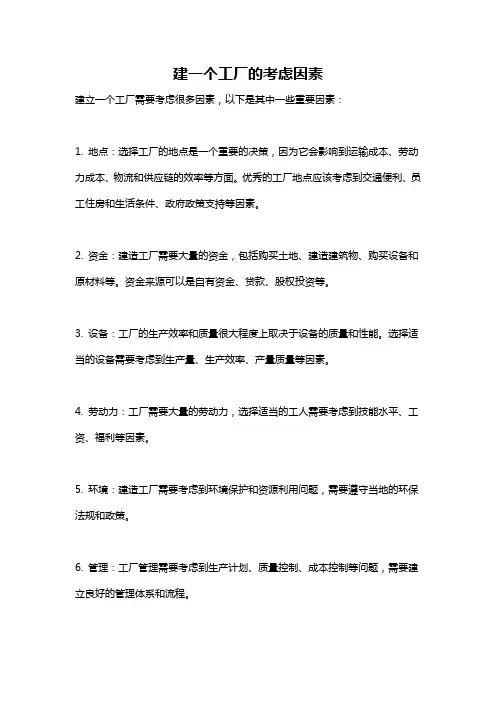 建立一个工厂需要考虑很多因素,以下是其中一些重要因素: