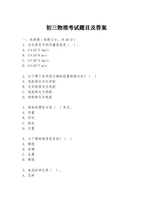 初三物理考试题目及答案一、选择题(每题3分,共30分)1. 光在真空中的传播速度是()。