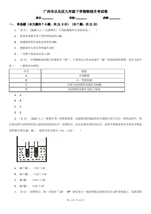 广州市从化区九年级下学期物理月考试卷姓名:________ 班级:________ 成绩:________一、单选题(本大题共7小题,共21.0分) (共7题;共21分)1. (3分) (2019九上·尤溪期中) 下列估测最符合实际的是()A . 家用电冰箱正常工作时的电流约18AB . 普通四冲程汽油机的效率约80%C . 健康成年人的正常体温约25℃D . 一节新干电池电压是1.5V2. (3分)小明触摸电冰箱门时感到手“麻”,下表列出小明对造成手“麻”原因的四种猜想,你认为其中的()猜想是合理的.序号猜想A火线断路B火、零线短路C火线与电冰箱的金属外壳接触D电冰箱的金属外壳接了底线A . AB . BC . CD . D3. (3分) (2018九上·番禺月考) 将质量相等,初温相同的煤油和水分别倒入两个完全一样的试管中,然后将这两个试管同时放入温度较高的热水中,如图所示,经过足够长的时间以后,试管中的煤油和水从热水中吸收的热量分别为Q1、Q2 ,温度升高分别为Δt1、Δt2()A . Q1=Q2 ,Δt1>Δt2B . Q1=Q2 ,Δt1=Δt2C . Q1<Q2 ,Δt1=Δt2D . Q1<Q2 ,Δt1>Δt24. (3分)如图所示,将一只标有”12V6W”的灯泡与一电阻串联后接到电压为12V的电源上,电阻消耗的功率为1W(假定灯丝电阻不变),则此时()A . 灯泡与电阻消耗的总功率为7WB . 灯泡与电阻消耗的总功率为6WC . 灯泡消耗的功率大于5WD . 灯泡消耗的功率小于5W5. (3分)为提高教育教学质量,推进优质教育资源共享,学校为各教室统一安装了电子白板投影仪.细心的小明同学经过查阅说明书,得知投影仪的光源是强光灯泡,发光时温度很高,必须用风扇给予降温,并且为了保证灯泡不被烧坏,要求:带动风扇的电动机启动后,灯泡才能发光;风扇不转,灯泡不能发光.于是她根据要求设计了以下四个简化电路,其中符合要求的是()A .B .C .D .6. (3分)关于电磁现象,下列说法中不正确的是()A . 电动机把电能转化为机械能B . 发电机是根据电磁感应原理制成的C . 奥斯特实验说明通电导线周围存在磁场D . 导体在磁场中运动,就会产生感应电流7. (3分) (2017九上·乐山期末) 如图所示,电源电压保持不变.闭合开关S,当滑动变阻器的滑片P向左移动时,电流表和电压表示数将怎样变化()A . 电压表示数变大,电流表示数变小B . 电压表示数变小,电流表示数变大C . 电压表示数变大,电流表示数变大D . 电压表示数变小,电流表示数变小二、多选题(本大题共3小题,共9.0分) (共3题;共9分)8. (3分)(2019·聊城) 有一只标有“6V 3W”字样的灯泡A和一只定值电阻B,A和B的电流随两端电压变化关系的图象如图甲所示。