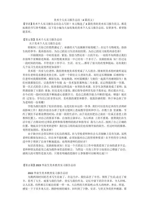 美术个人实习报告总结(4篇范文)【导语】美术个人实习报告总结怎么写好?本文精选了4篇优秀的美术实习报告范文,都是标准的书写参考模板。