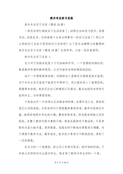美术专业实习总结美术专业实习总结(精选10篇)一段充实而忙碌的实习生活结束了,回顾过去的实习经历,倍感充实,收获良多,这时候就十分有必须要写一份实习总结了!那么什么样的实习总结才是好的实习总结呢?以下是本店铺帮大家整理的美术专业实习总结(精选10篇)仅供参考,大家一起来看看吧。