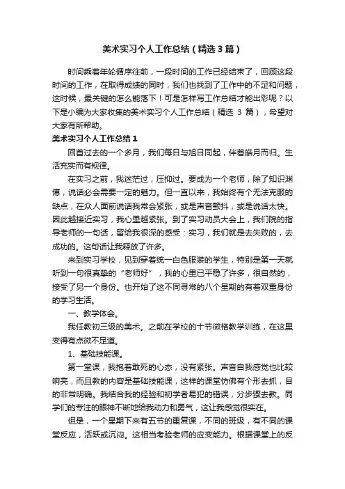 美术实习个人工作总结(精选3篇)时间乘着年轮循序往前,一段时间的工作已经结束了,回顾这段时间的工作,在取得成绩的同时,我们也找到了工作中的不足和问题,这时候,最关键的怎么能落下!可是怎样写工作总结才能出彩呢?以下是小编为大家收集的美术实习个人工作总结(精选3篇),希望对大家有所帮助。