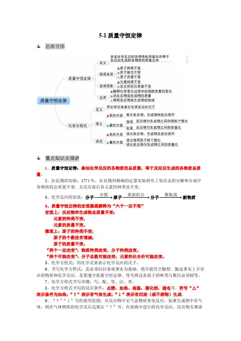 5-1质量守恒定律思维导图重点知识点细讲1、质量守恒定律:参加化学反应的各物质的总质量,等于反应后生成的各物质总质量。