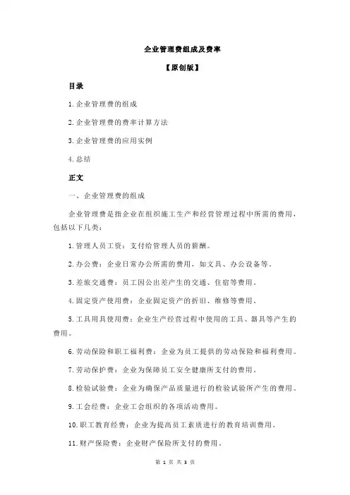 二、企业管理费(一)企业管理费的内容企业管理费是指建筑安装企业组织施工生产和经营管理所需费用,包括以下内容:1.管理人员工资管理人员工资是指管理人员的基本工资、工资性补贴、职工福利费、劳动保护费等。